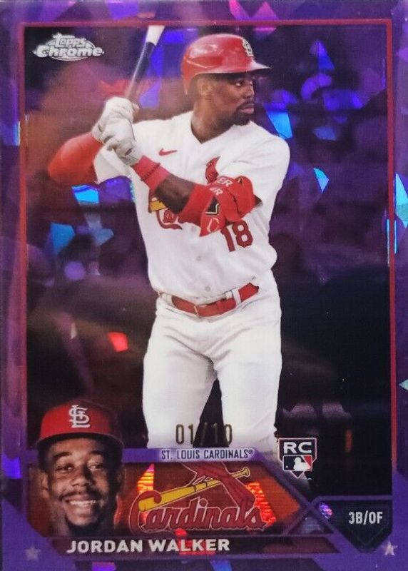 The Jordan Walker 2023 Topps Chrome Sapphire Edition #344 Purple /10 Rookie card in Raw condition has not changed in price in the last 30 days and was last sold for $130.55 .