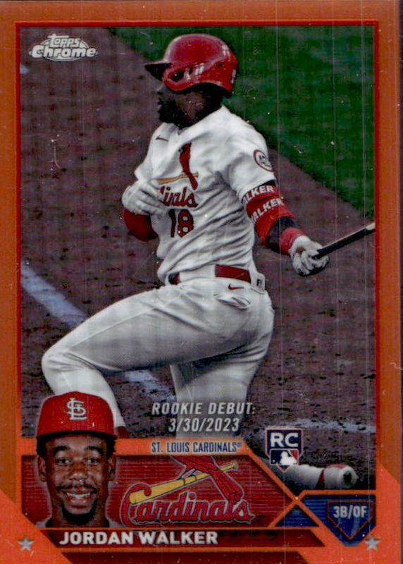 The Jordan Walker 2023 Topps Chrome Update #USC150 Rookie Debut - Orange Refractor /25 card in Raw condition has not changed in price in the last 30 days and was last sold for $15.00 .