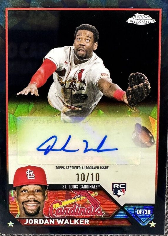 The Jordan Walker 2023 Topps Chrome Update Sapphire Edition #USA-JW Autographs - Black /10 Rookie card in Raw condition has not changed in price in the last 30 days and was last sold for $275.00 .