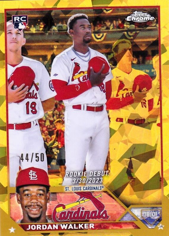 The Jordan Walker 2023 Topps Chrome Update Sapphire Edition #USCS298 Rookie Debut - Gold /50 card in Raw condition has not changed in price in the last 30 days and was last sold for $80.00 .