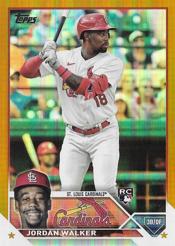 The Jordan Walker 2023 Topps #344 Gold Foil Rookie card in Raw condition has moved up $7.00 (+234%) in the last 30 days and was last sold for $9.99 .