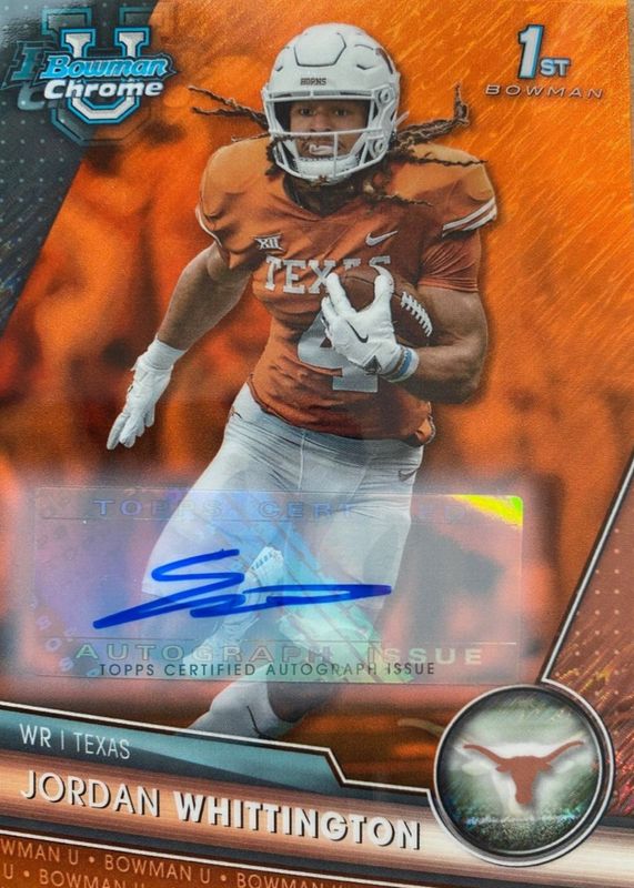 This card is 1 of 12 Jordan Whittington's card variations in the 2023 Bowman Chrome University set being tracked by Sports Card Investor, including Prospect Auto (1st), Prospect Auto - Refractor /499 (1st), Prospect Auto - Fuchsia Mini-Diamond Refractor /150 (1st), Prospect Auto - Green Refractor /99 (1st), and Prospect Auto - Yellow Refractor /75 (1st).