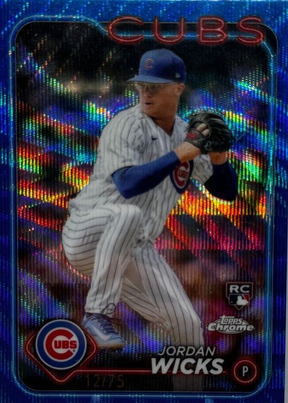 The Jordan Wicks 2024 Topps Chrome #67 Blue Wave Refractor /75 Rookie card in Raw condition has not changed in price in the last 30 days and was last sold for $5.50 .