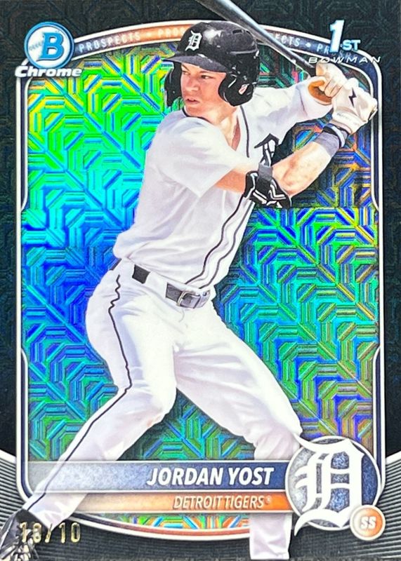 This card is 1 of 10 Jordan Yost's card variations in the 2025 Bowman Draft Mega Box set being tracked by Sports Card Investor, including Chrome (1st), Chrome - Purple Mega Refractor /250 (1st), Chrome - Blue Mega Refractor /150 (1st), Chrome - Green Mega Refractor /99 (1st), and Chrome - Yellow Mega Refractor /75 (1st).