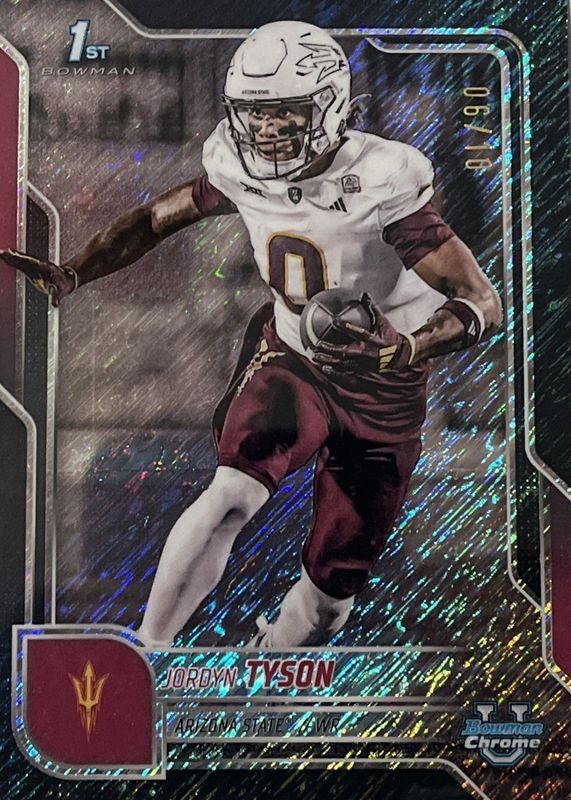 The Jordyn Tyson 2025 Bowman Chrome University #31 Black Shimmer Refractor /10 (1st) card in Raw condition has not changed in price in the last 30 days and was last sold for $117.53 .