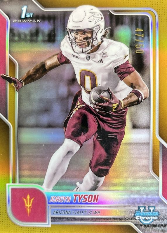 This card is 1 of 54 Jordyn Tyson's card variations in the 2025 Bowman Chrome University set being tracked by Sports Card Investor, including Base (1st), Pink Lava Refractor (1st), Refractor (1st), Shimmer Refractor (1st), and Stealth Refractor (1st).