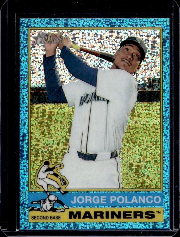 The Jorge Polanco 2025 Topps Heritage #97 Chrome - Aqua Sparkle Refractor card is 1 of 24 Jorge Polanco's card variations in the 2025 Topps Heritage set being tracked by Sports Card Investor, including Base, Black Border, Dark Blue Border, Dark Green Border, and Dark Yellow Border.