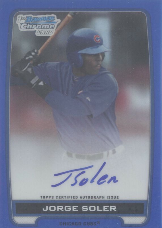 The Jorge Soler 2012 Bowman Chrome #BCA-JSO Prospect Auto - Blue Refractor /150 (1st) card in Raw condition has not changed in price in the last 30 days and was last sold for $50.00 .