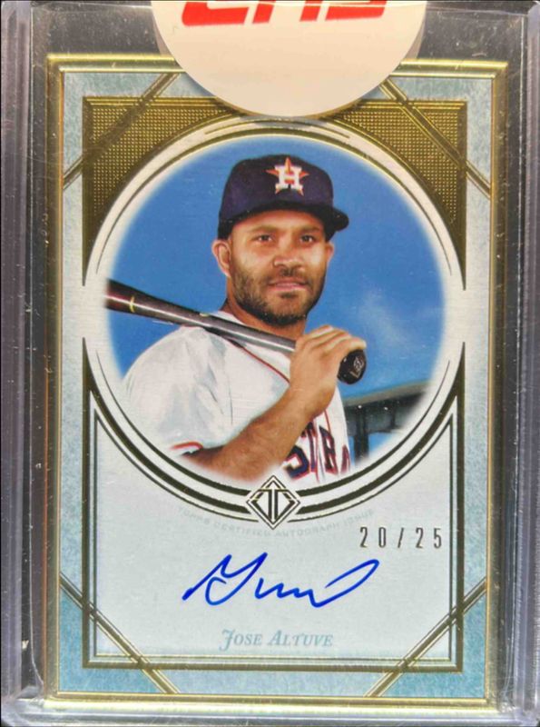 The Jose Altuve 2018 Topps Transcendent #TCA-JA Transcendent Collection Autographs /25 card is 1 of 8 Jose Altuve's card variations in the 2018 Topps Transcendent set being tracked by Sports Card Investor, including Base /83, Transcendent Collection Autographs Emerald /15, Transcendent Collection Autographs Purple /10, 1952 SuperFractor Autographs /1, and 1983 Autographs Relics /1.