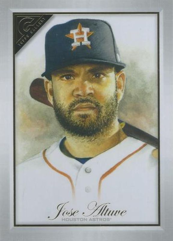 The Jose Altuve 2019 Topps Gallery #OBT-JA Oversized Box Toppers card is 1 of 26 Jose Altuve's card variations in the 2019 Topps Gallery set being tracked by Sports Card Investor, including Base, Artist Proof, Wood, Private Issue /250, and Green /99.