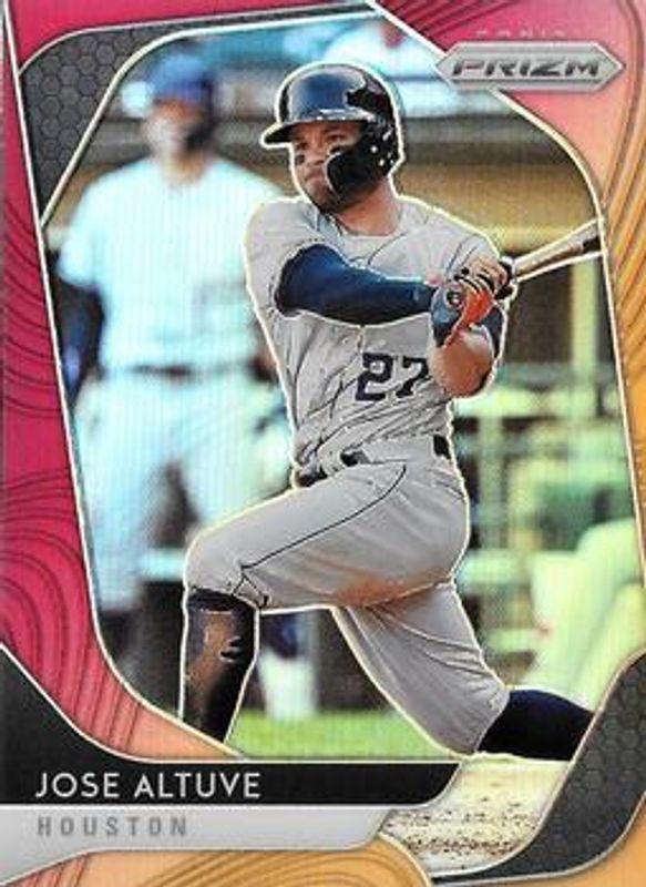 The Jose Altuve 2020 Prizm #221 Red-Orange card is 1 of 119 Jose Altuve's card variations in the 2020 Prizm set being tracked by Sports Card Investor, including Base, Blue, Carolina Blue, Cosmic Haze, and Green.