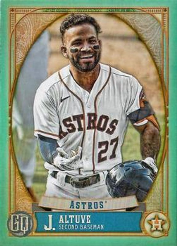 The Jose Altuve 2021 Topps Gypsy Queen #20 Turquoise /199 card is 1 of 24 Jose Altuve's card variations in the 2021 Topps Gypsy Queen set being tracked by Sports Card Investor, including Base, Bazooka Back, Green, Missing Nameplate, and Team Script Font Swap.