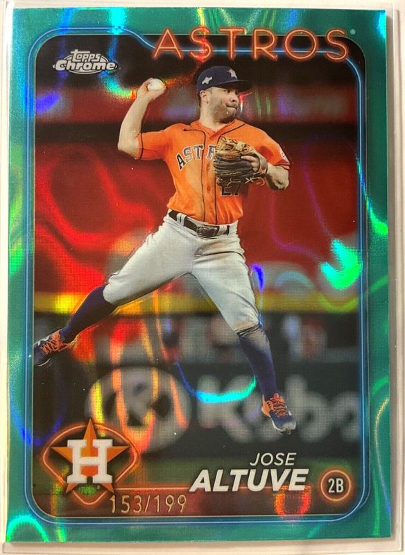 The Jose Altuve 2024 Topps Chrome #58 Aqua Lava Refractor /199 card is 1 of 15 Jose Altuve's card variations in the 2024 Topps Chrome set being tracked by Sports Card Investor, including Base, Pink Refractor, Aqua RayWave Refractor /199, Aqua Refractor /199, and Blue RayWave Refractor /150.