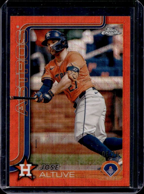 The Jose Altuve 2025 Topps Chrome #77 Orange Wave Refractor /25 card is 1 of 66 Jose Altuve's card variations in the 2025 Topps Chrome set being tracked by Sports Card Investor, including Base, Geometric Refractor, Image Variation, Lightboard Logo Variation, and Negative Refractor.