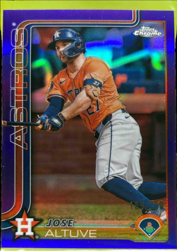 The Jose Altuve 2025 Topps Chrome #77 Purple Refractor /250 card is 1 of 66 Jose Altuve's card variations in the 2025 Topps Chrome set being tracked by Sports Card Investor, including Base, Geometric Refractor, Image Variation, Lightboard Logo Variation, and Negative Refractor.