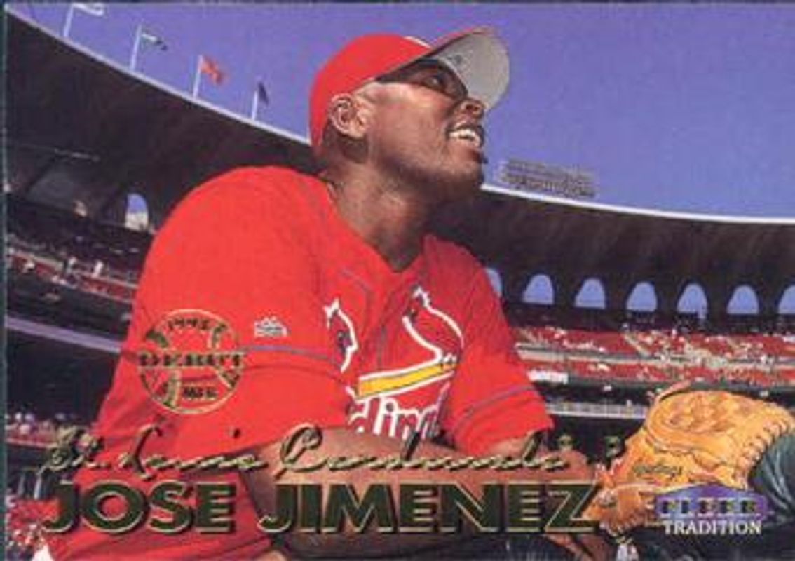The Jose Jimenez 1999 Fleer Tradition #427 Base card is 1 of 4 Jose Jimenez's card variations in the 1999 Fleer Tradition set being tracked by Sports Card Investor, including Millennium, Warning Track Collection, and Starting 9 /9.