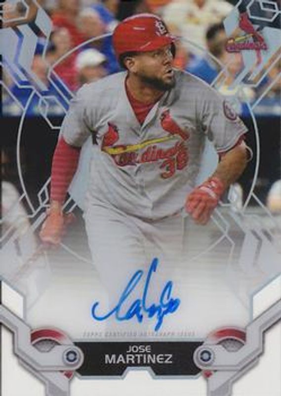 The Jose Martinez 2019 Topps High Tek #HTA-JM Autographs card is 1 of 7 Jose Martinez's card variations in the 2019 Topps High Tek set being tracked by Sports Card Investor, including Autographs - Purple /99, Autographs - Pink /75, Autographs - Black /50, Autographs - Orange /25, and Autographs - Red /10.