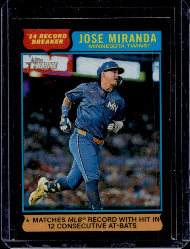 The Jose Miranda 2025 Topps Heritage #4 Chrome - Black Refractor /76 card is 1 of 24 Jose Miranda's card variations in the 2025 Topps Heritage set being tracked by Sports Card Investor, including Base, Black Border, Dark Blue Border, Dark Green Border, and Dark Yellow Border.