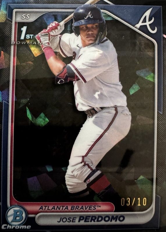 The Jose Perdomo 2024 Bowman Chrome Sapphire Edition #BCP-220 Prospects - Black /10 (1st) card in Raw condition has not changed in price in the last 30 days and was last sold for $63.88 .