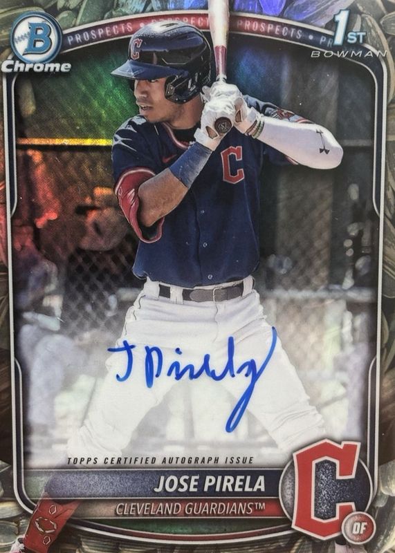 This card is 1 of 32 Jose Pirela's card variations in the 2025 Bowman set being tracked by Sports Card Investor, including Chrome Prospect Auto (1st), Chrome Prospect Auto - Refractor /499 (1st), Chrome Prospect Auto - Speckle Refractor /299 (1st), Chrome Prospect Auto - Purple Refractor /250 (1st), and Chrome Prospect Auto - Blue Refractor /150 (1st).