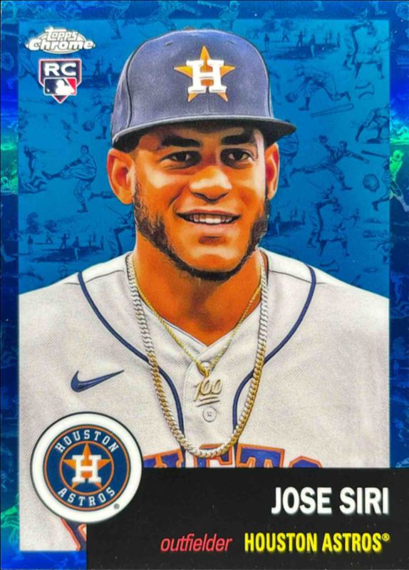 The Jose Siri 2022 Topps Chrome Platinum Anniversary #124 Platinum Toile White Blue Refractor /199 Rookie card is 1 of 34 Jose Siri's card variations in the 2022 Topps Chrome Platinum Anniversary set being tracked by Sports Card Investor, including Base, Black & White Mini Diamond Refractor, Blue Prism Refractor, Gold Prism Refractor, and Prism Refractor.