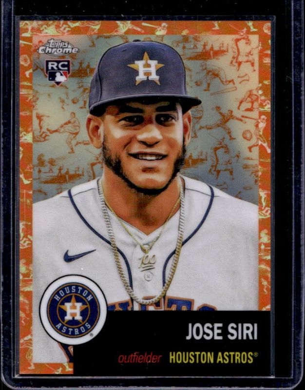The Jose Siri 2022 Topps Chrome Platinum Anniversary #124 Platinum Toile White Orange Refractor /25 Rookie card is 1 of 34 Jose Siri's card variations in the 2022 Topps Chrome Platinum Anniversary set being tracked by Sports Card Investor, including Base, Black & White Mini Diamond Refractor, Blue Prism Refractor, Gold Prism Refractor, and Prism Refractor.
