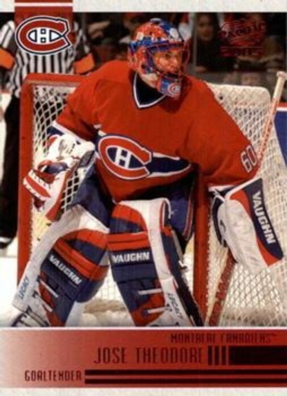 The Jose Theodore 2004 Pacific #143 Red card is 1 of 5 Jose Theodore's card variations in the 2004 Pacific set being tracked by Sports Card Investor, including Base, Blue /250, All Stars, and In the Crease.