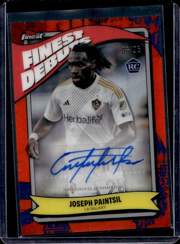 The Joseph Paintsil 2024 Topps Finest MLS #FDA-JP Finest Debut Autographs - Orange Refractor /25 Rookie card is 1 of 63 Joseph Paintsil's card variations in the 2024 Topps Finest MLS set being tracked by Sports Card Investor, including #128 Base, #28 Base, #294 Base, #128 Aqua Refractor, and #28 Aqua Refractor.