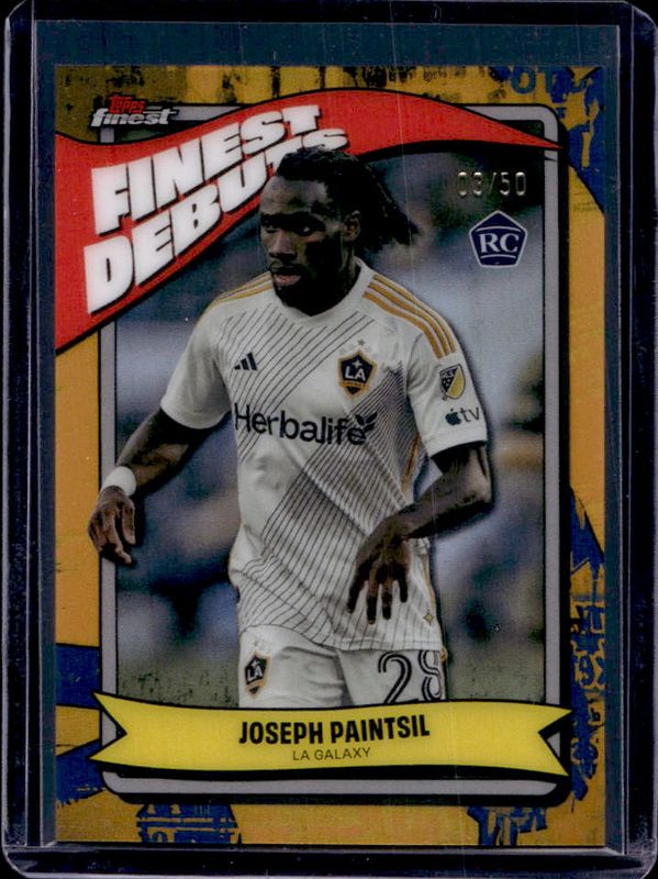 The Joseph Paintsil 2024 Topps Finest MLS #FD-10 Finest Debuts - Gold Refractor /50 Rookie card is 1 of 63 Joseph Paintsil's card variations in the 2024 Topps Finest MLS set being tracked by Sports Card Investor, including #128 Base, #28 Base, #294 Base, #128 Aqua Refractor, and #28 Aqua Refractor.