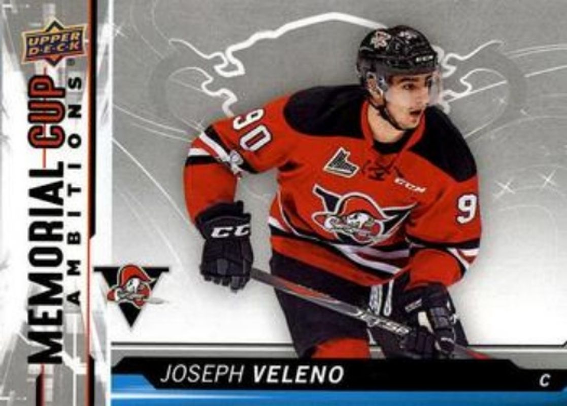 The Joseph Veleno 2018 Upper Deck CHL #CA-3 Memorial Cup Ambitions card is 1 of 8 Joseph Veleno's card variations in the 2018 Upper Deck CHL set being tracked by Sports Card Investor, including Base, Silver, Printing Plates Black /1, Printing Plates Cyan /1, and Printing Plates Magenta /1.