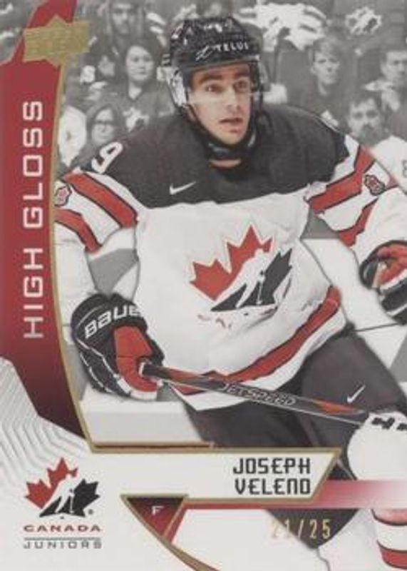 The Joseph Veleno 2019 Upper Deck Team Canada Juniors #23 High Gloss /25 card is 1 of 9 Joseph Veleno's card variations in the 2019 Upper Deck Team Canada Juniors set being tracked by Sports Card Investor, including #129 Base, #23 Base, #23 Jersey Relics, #23 Exclusives /150, and #129 Exclusives /150.