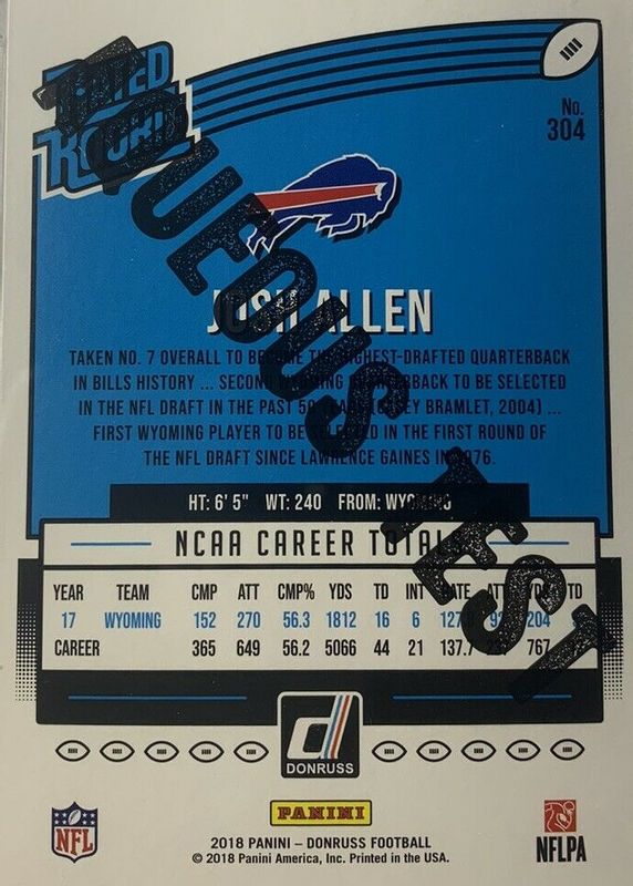 Josh Allen 2018 Donruss #304 Aqueous Test Rookie RAW Price Guide