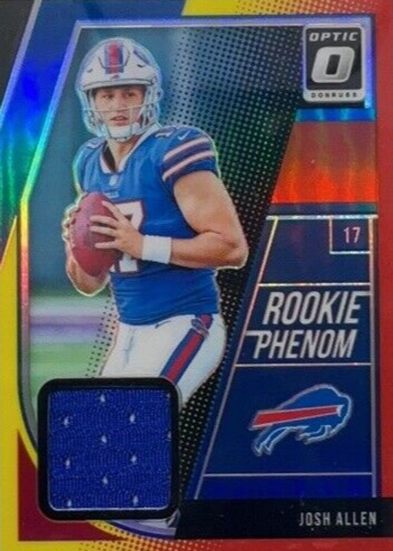 The Josh Allen 2018 Optic #RP-JA Rookie Phenom Jerseys Vertical - Red & Yellow card in Raw condition has not changed in price in the last 30 days and was last sold for $134.99 .