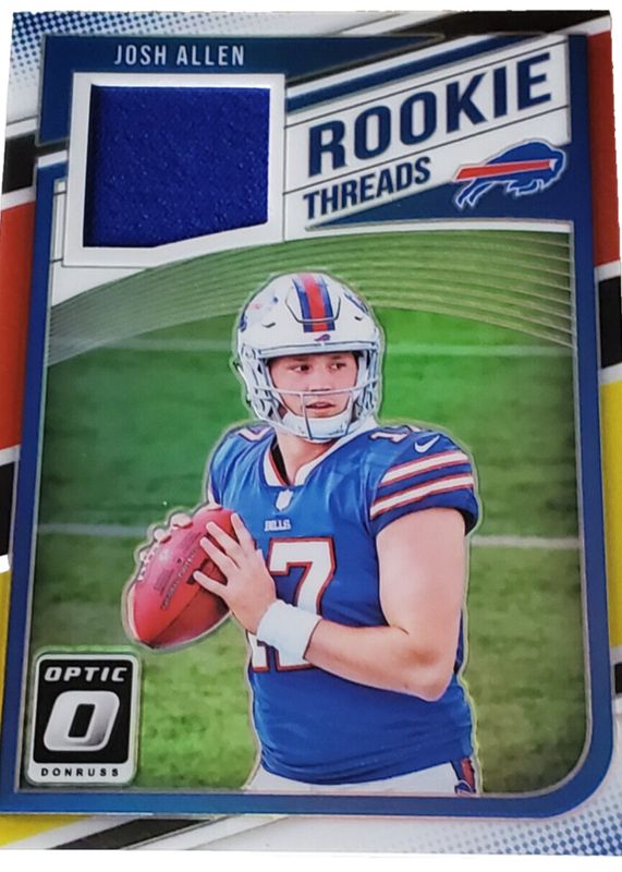 The Josh Allen 2018 Optic #RT-JA Rookie Threads - Red & Yellow card in Raw condition has not changed in price in the last 30 days and was last sold for $145.00 .