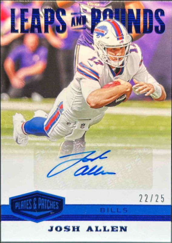 The Josh Allen 2019 Plates & Patches #LB-JAL Leaps & Bounds Autographs - Blue /35 card is 1 of 72 Josh Allen's card variations in the 2019 Plates & Patches set being tracked by Sports Card Investor, including #197 Base /99, #13 Base /99, #13 Blue /60, #197 Blue /60, and #13 Purple /35.