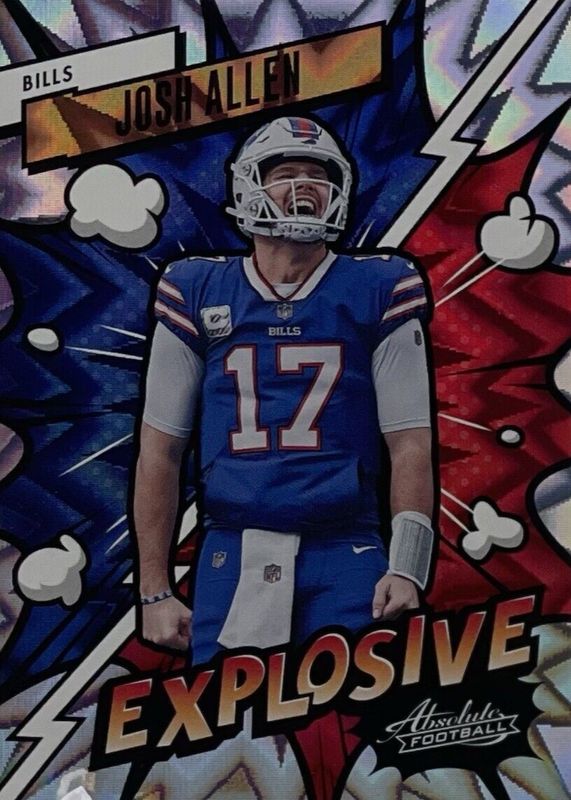 The Josh Allen 2023 Absolute #6 Explosive /(SSP) card in Raw condition has moved up $19.50 (+8.3%) in the last 30 days and was last sold for $255.00 .