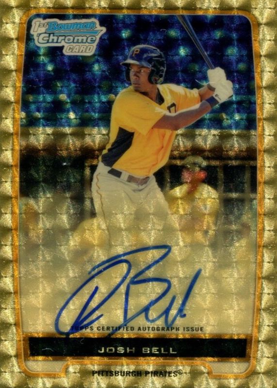 This card is 1 of 9 Josh Bell's card variations in the 2012 Bowman set being tracked by Sports Card Investor, including Chrome Prospect Auto (1st), Chrome Prospect Auto - Refractor /500 (1st), Chrome Prospect Auto - Blue Refractor /150 (1st), Chrome Prospect Auto - Blue Wave Refractor /50 (1st), and Chrome Prospect Auto - Gold Refractor /50 (1st).