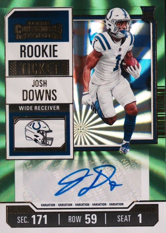 This card is 1 of 30 Josh Downs' card variations in the 2023 Contenders set being tracked by Sports Card Investor, including Rookie Ticket Auto, Rookie Ticket Auto - Opening Kickoff Ticket, Rookie Ticket Auto - Red Zone Ticket, Rookie Ticket Auto - Ticket Stub (/1), and Rookie Ticket Auto Variation.