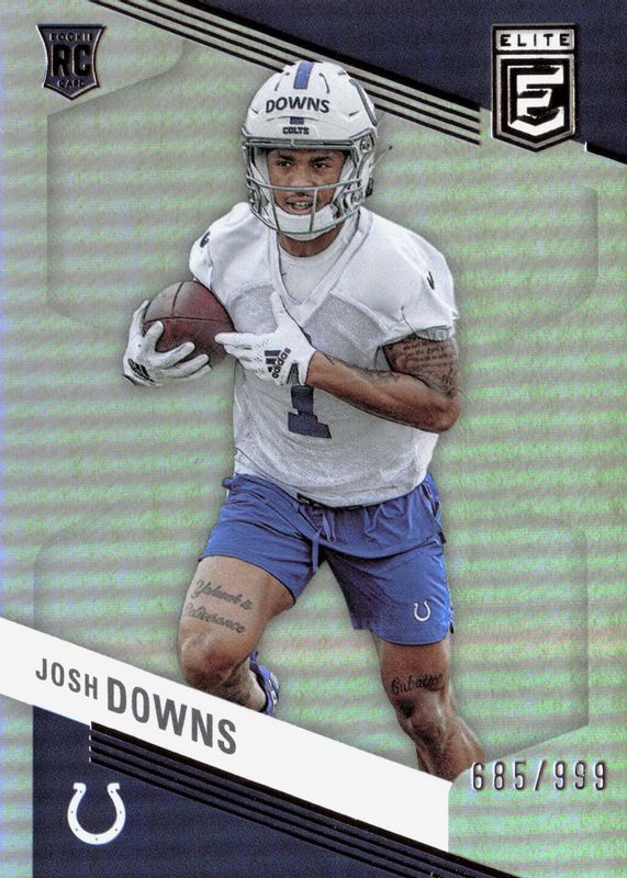 This card is 1 of 38 Josh Downs' card variations in the 2023 Elite set being tracked by Sports Card Investor, including Aspirations (/99), Green Disco, Pink, Status (/1), and Aspirations Shimmer /625.