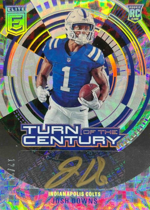 The Josh Downs 2023 Elite #TC-JOS Turn of the Century Autographs - Black Gold /25 Rookie card in Raw condition has not changed in price in the last 30 days and was last sold for $9.50 .