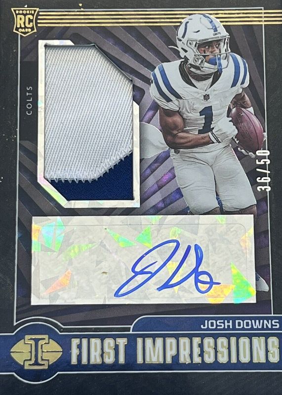 This card is 1 of 10 Josh Downs' card variations in the 2023 Illusions set being tracked by Sports Card Investor, including First Impressions Memorabilia Autographs /399, First Impressions Memorabilia Autographs - Red /199, First Impressions Memorabilia Autographs - Blue /99, First Impressions Memorabilia Autographs - Black Ice FOTL /50, and First Impressions Memorabilia Autographs - Gold /25.