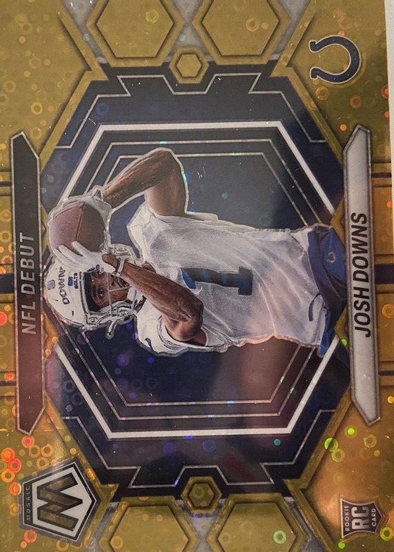 The Josh Downs 2023 Mosaic #ND-15 NFL Debut - No Huddle Gold /10 Rookie card in Raw condition has not changed in price in the last 30 days and was last sold for $52.00 .