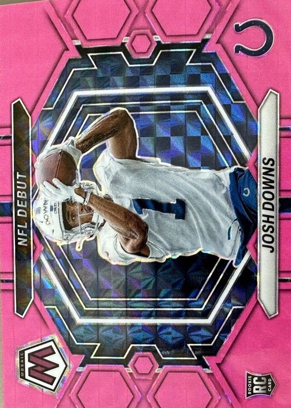 The Josh Downs 2023 Mosaic #ND-15 NFL Debut - Pink Fluorescent /10 Rookie card in Raw condition has not changed in price in the last 30 days and was last sold for $120.00 .