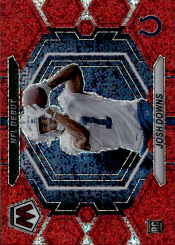 The Josh Downs 2023 Mosaic #ND-15 NFL Debut - Red Sparkle /(SSP) Rookie card in Raw condition has not changed in price in the last 30 days and was last sold for $9.00 .