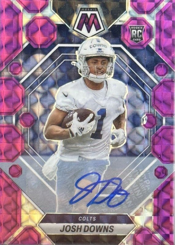 The Josh Downs 2023 Mosaic #339 Rookie Autographs - Purple (/49) card in Raw condition has not changed in price in the last 30 days and was last sold for $49.00 .