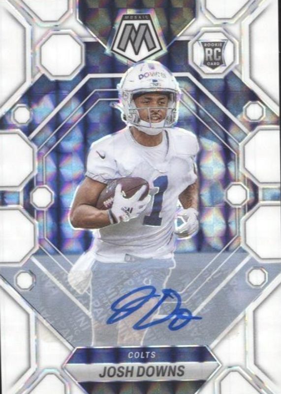 The Josh Downs 2023 Mosaic #339 White /25 Rookie card in Raw condition has not changed in price in the last 30 days and was last sold for $24.50 .