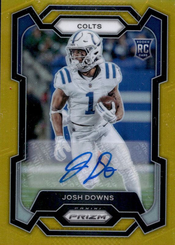 The Josh Downs 2023 Prizm #345 Rookie Autographs - Gold /10 card in Raw condition has not changed in price in the last 30 days and was last sold for $203.38 .