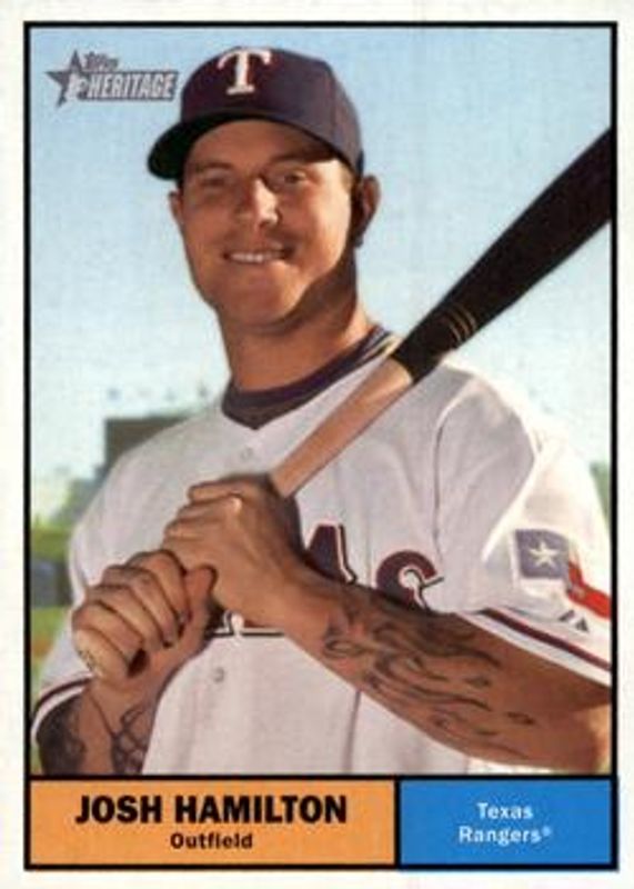 The Josh Hamilton 2010 Topps Heritage #294 Base card is 1 of 6 Josh Hamilton's card variations in the 2010 Topps Heritage set being tracked by Sports Card Investor, including Base, Chrome /1961, Chrome Refractor /561, Chrome Black Refractor /61, and Framed Dual Stamps /50.