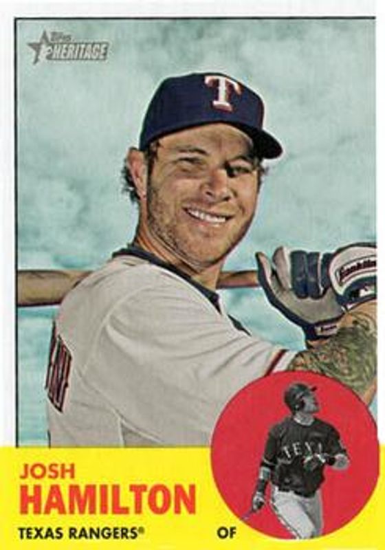 The Josh Hamilton 2012 Topps Heritage #486a Base card is 1 of 5 Josh Hamilton's card variations in the 2012 Topps Heritage set being tracked by Sports Card Investor, including Base, Clubhouse Collection Relics, Stick Ons, and Image Swap Variation Relics /63.