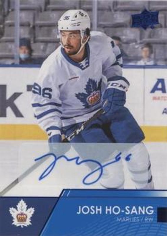The Josh Ho Sang 2021 Upper Deck AHL #38 Autographs card is 1 of 9 Josh Ho Sang's card variations in the 2021 Upper Deck AHL set being tracked by Sports Card Investor, including Base, Exclusives /100, High Gloss /10, Blue, and Printing Plates - Black /1.